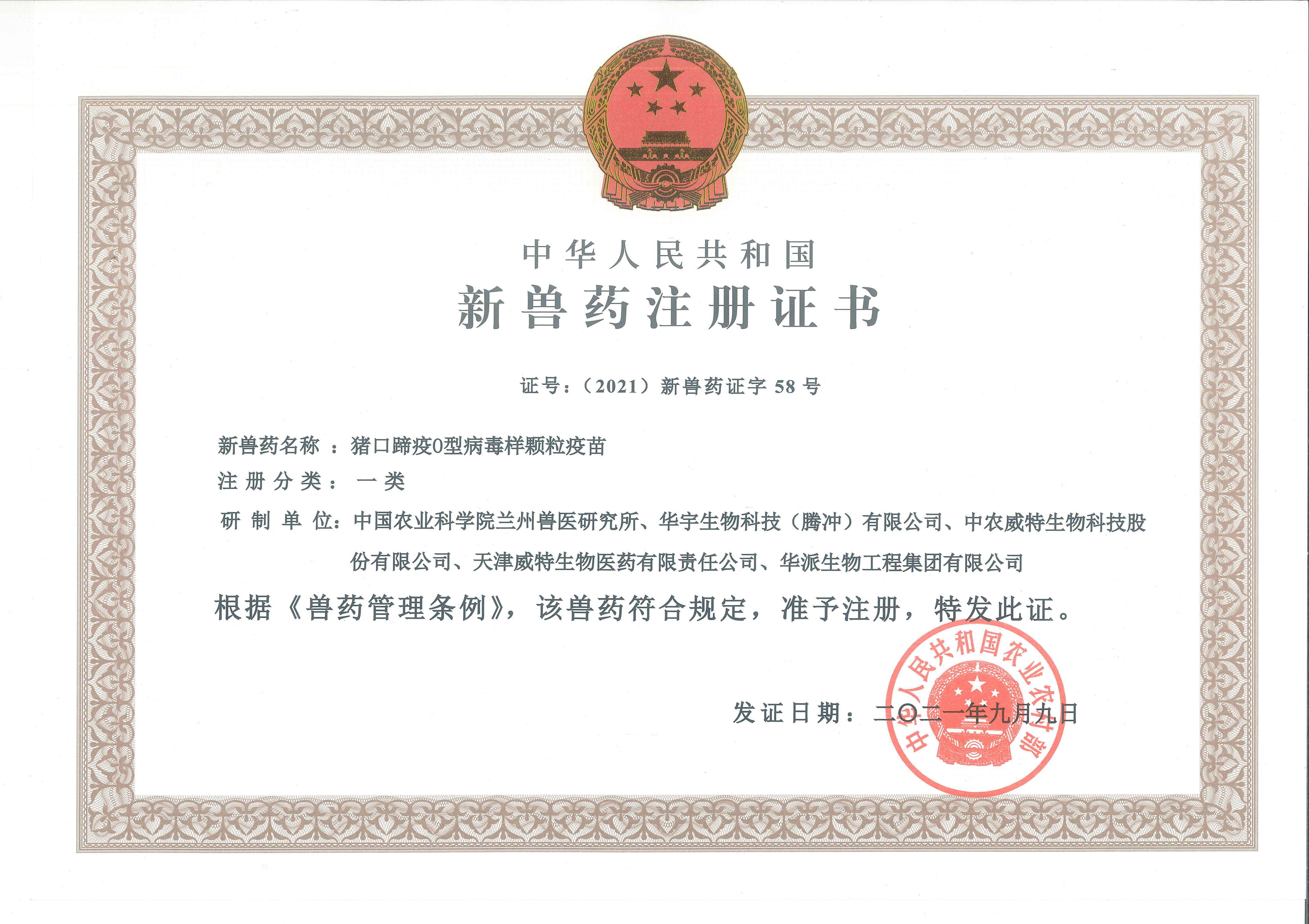 猪口蹄疫O型新兽药注册证书(一类)