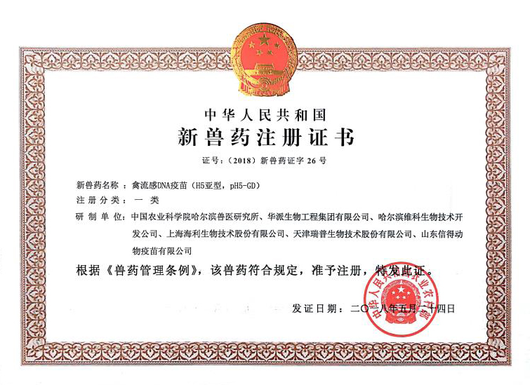 禽流感DNA新兽药证书(一类)