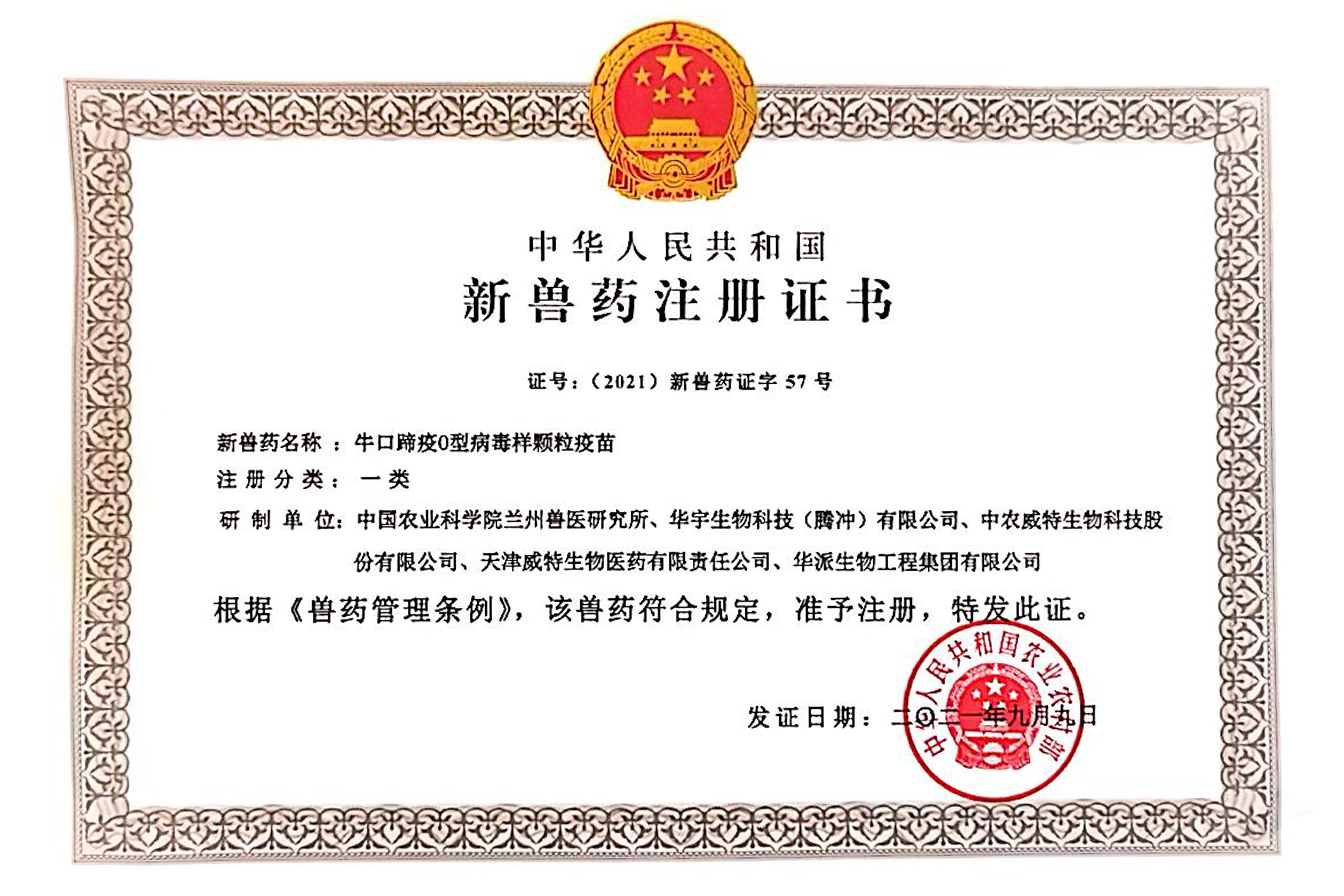 牛口蹄疫O型新兽药证书(一类)