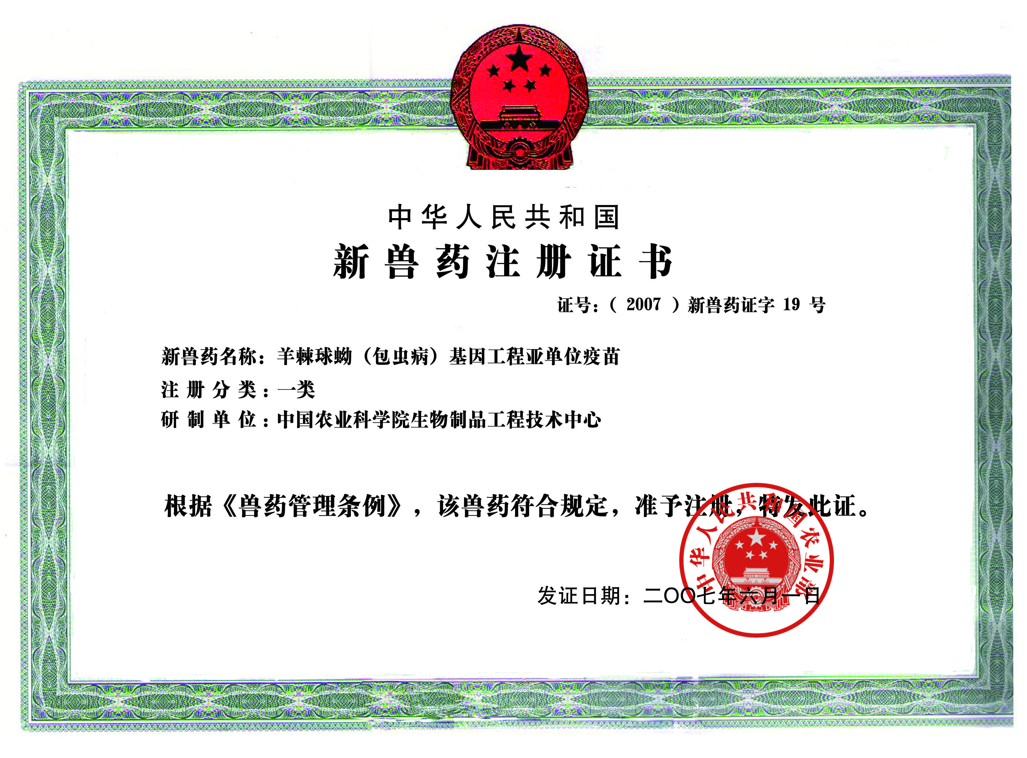 羊棘球蚴(包虫病)基因工程亚单位疫苗新兽药证书(一类)