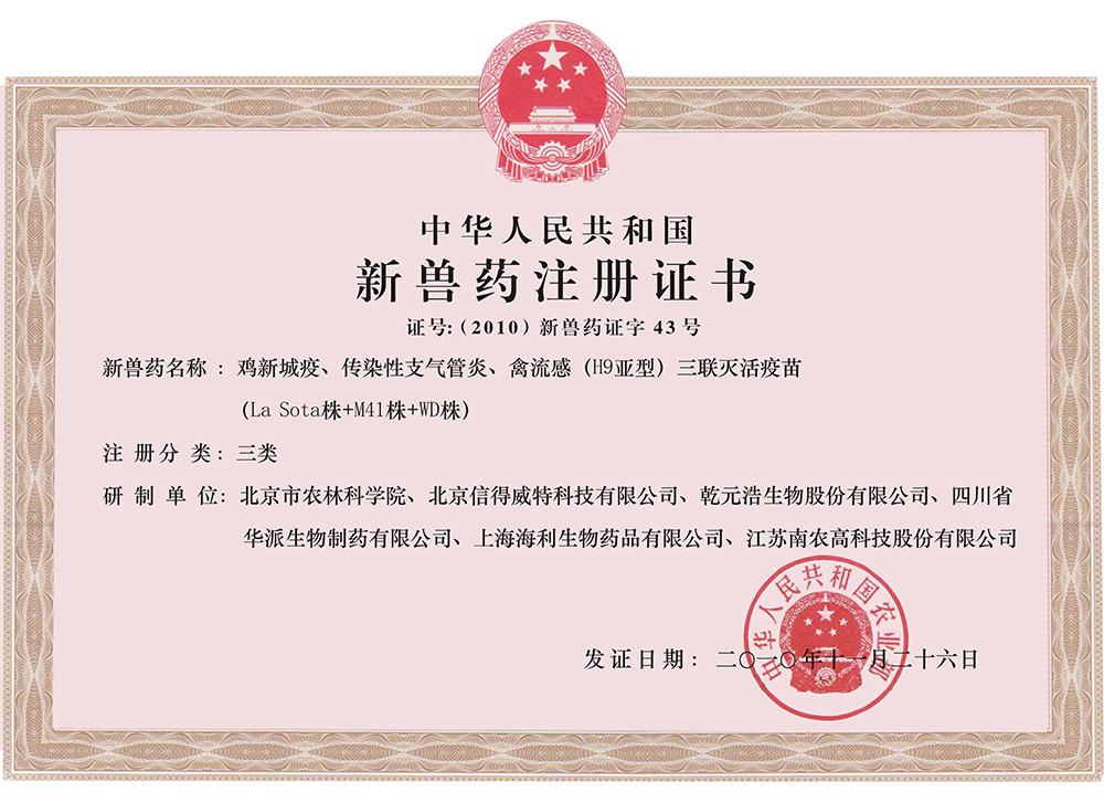 鸡新城疫、禽流感(H9亚型)二联灭活疫苗(La Sota株+HN106株)